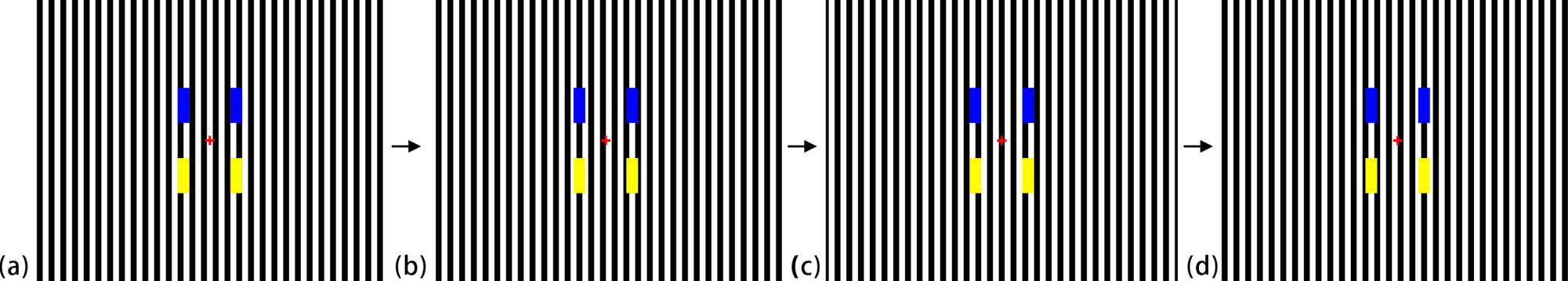 For the inverted footsteps illusion, let us start with a condition like Fig. 5a in which the edges of rectangles touch those of the stripes. In this condition, the spacing between the upper two rectangles appears to be smaller than that between the lower two rectangles, although they are the same distance apart. When the grating moves rightward behind the rectangles (Fig. 5b), the upper-left rectangle appears to be stationary as it is while the upper-right one appears to be captured by the moving grating and to move rightward. Thus, the upper spacing appears to increase. On the contrary, the lower-left rectangle appears to be captured by the moving grating and to move rightward, while the lower-right one appears to be stationary as it is. Thus, the lower spacing appears to decrease. When edges of the rectangles touch those of stripes again (Fig. 5c), the upper spacing appears to be larger than the lower one. Finally, when the grating moves rightward (Fig. 5d), the upper-left rectangle appears to be captured by the moving grating and to move rightward while the upper-right one appears to be stationary as it is. Thus, the upper spacing appears to decrease. On the contrary, the lower-left rectangle appears to be stationary as it is while the lower-right one appears to be captured by the moving grating and to move rightward. Thus, the upper spacing appears to increase. This repetition makes the rectangles appear to move like a footstep.