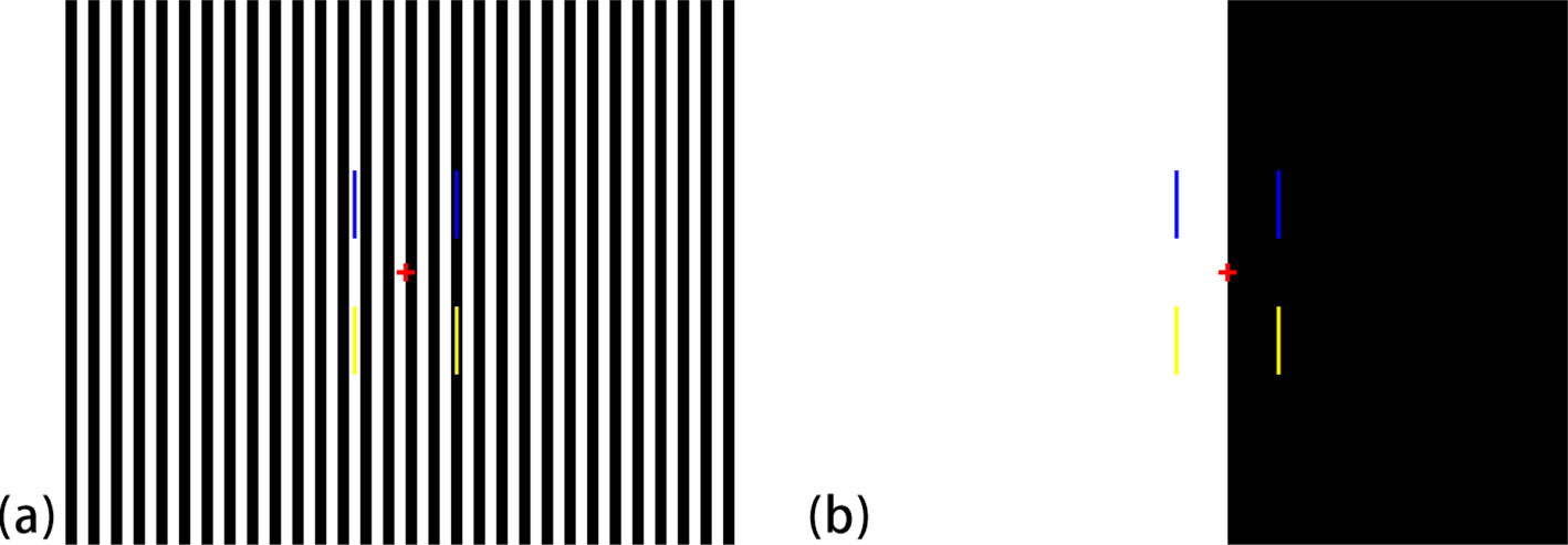 Fig. 6. An extinction effect of edges of low contrast. (a) A grating condition. The upper-right blue thin line segment embedded in a black stripe and the lower-left yellow line segment embedded in a white stripe, that is, edges of low contrast, appear to extinguish rapidly when observers fixate at the cross. The other two line segments of high contrast hardly appear to extinguish. (b) A homogeneous-background condition. Although the upper-right and lower-left ones are of low contrast, they do not appear to extinguish rapidly.