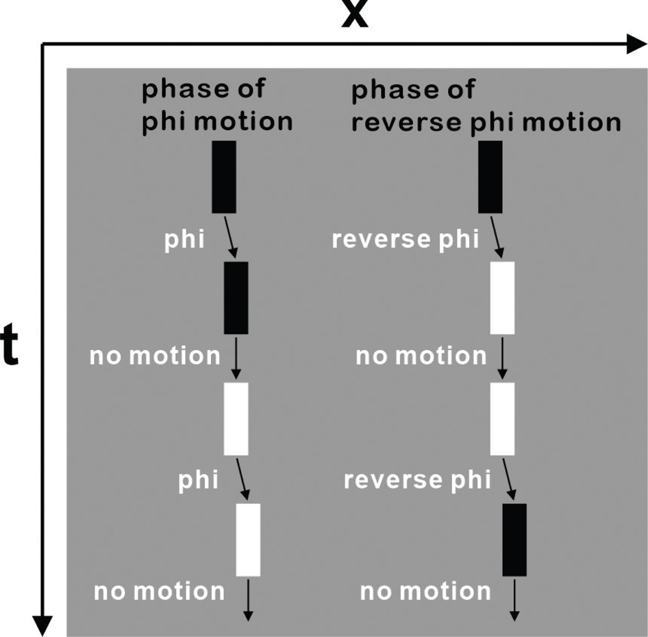 Fig. 14. The phase of phi motion and that of reverse phi motion installed in Movie 38. One phase consists of a repetition of four frames (70 ms for each). Rectangles move 1 pixel from the first frame to the second one. They stay there from the second to the third. They move 1 pixel from the third to the fourth. They stay there from the fourth frame back to the first one of the next phase. For phi motion, contrast polarity does not change when rectangles move, whereas it changes while they stay there. Inversely, for reverse phi motion, contrast polarity changes when rectangles move, whereas it does not change while they stay there. The phase of phi motion is repeated five times (1,400 ms), followed by the phase of reverse phi motion that is repeated five times, and vice versa.