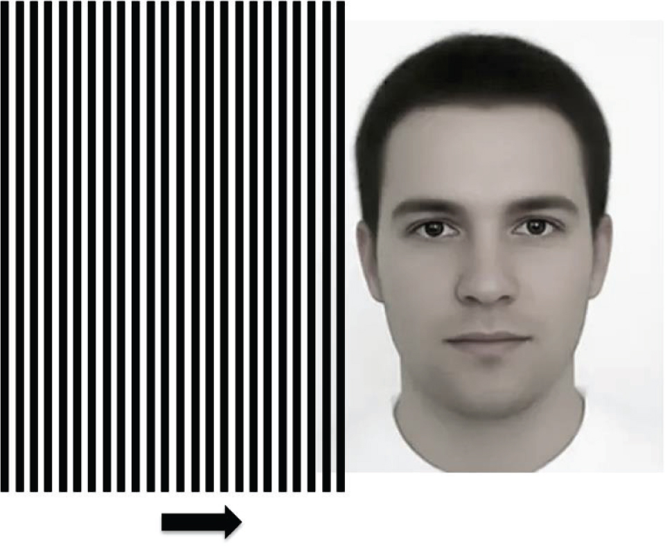 The basic parameters of the illusion are illustrated in Fig. 2. The static image that serves as the basis for the effect is a single forward-looking face. I’ve selected an average face for this demonstration, but the effect is robust to the choice of specific face image. As in most Barrier-grid animations, the overlaid grating is a set of vertical stripes. By moving this grating across the face (Movie 1 – gratingFaceIllusion_Nystagmus.mp4), we see that nystagmus-like eye movements (horizontal scanning) are induced in the face, even though there are no explicit frames depicting the eyes in different positions included in the base image. Further, by changing properties of the grating, different illusory eye movements can be generated. For example, in Movie 2 (gratingFaceIllusion_Swirling.mp4) I have applied a vertical grating that has a slightly different spatial frequency and also has closer spacing of the black stripes in the grating. The result is a sort of ‘swirling’ pattern of movement in which the eyes appear to roll around as the grating moves from left to right. Finally, in Movie 3 (gratingFaceIllusion_VerticalScanning.mp4), I use still another spatial frequency (this time including thicker black stripes) to induce eye movements that are either perceived as vertical scanning or as blinking.